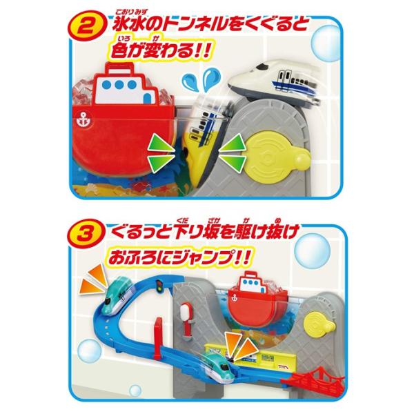 ハンドルを回すと新幹線(はやぶさ、ドクターイエロー)がおふろのレールを走り、氷水のトンネルを通ると色が変わるよ。