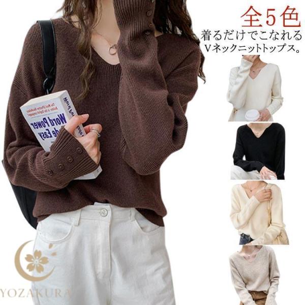 セーター Vネック リブニット レディース 秋 長袖 袖ボタン 体型カバー トップス 冬 ゆったり きれいめ カジュアル ニットトップス 防寒 暖かい