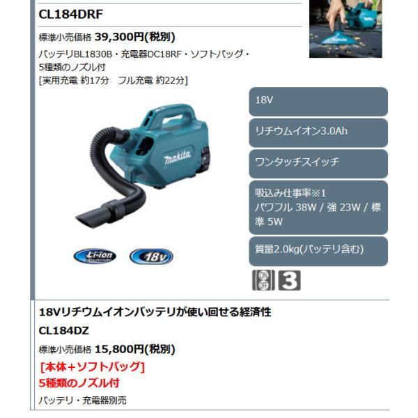 マキタ 18V 掃除機 CL184DRF 充電式クリーナー 紙パック式 3.0Ahバッテリ・充電器・ソフトバッグ付
