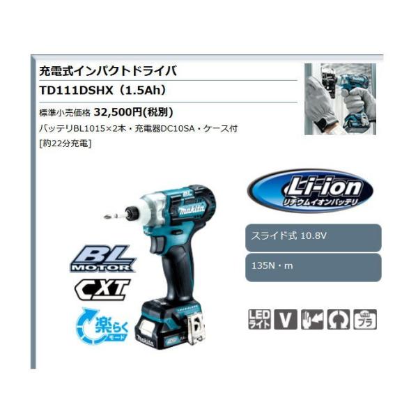 マキタ 10.8V 充電式インパクトドライバ TD111DSHX 1.5Ahバッテリ2個・充電器・ケース付
