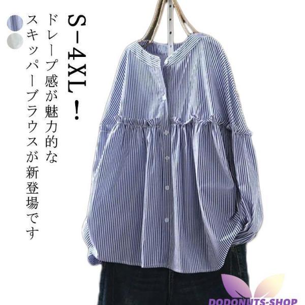 シャツ レディース ブラウス ストライプ柄 春夏 ス シャツ 体型カバー 長袖 ラウンドネック シャツ 森ガール ゆったり 大きいサイ