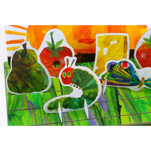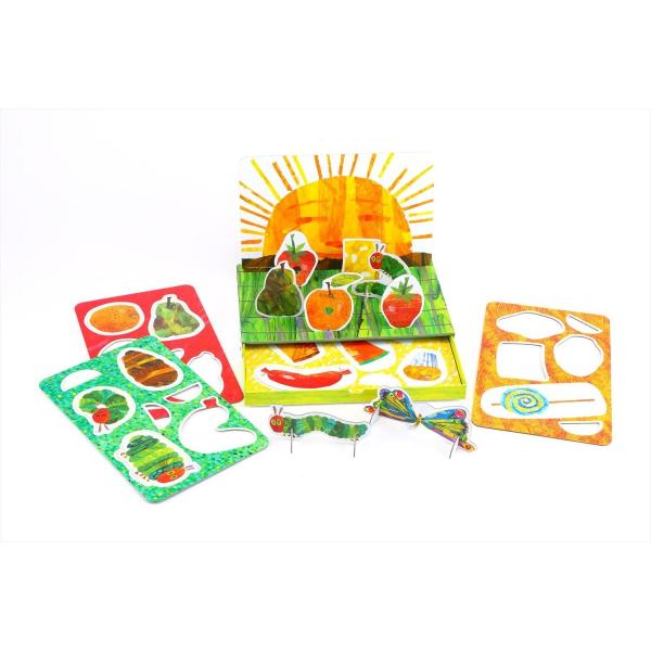 ボックスの引きだしの中にある厚紙をくり抜いて、ボックス上の溝に立てれば、ホラ、簡単にエリック・カールの「はらぺこあおむし」劇場のできあがり。インテリアのオーナメントとしてもかわいいアイテム。