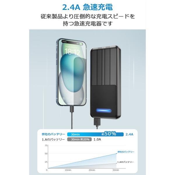 出力は最大2.4A急速充電可能ですから、素早く蓄電可能、より長持ちで旅先やちょっとした外出、出張の際の強い味方に最適です。