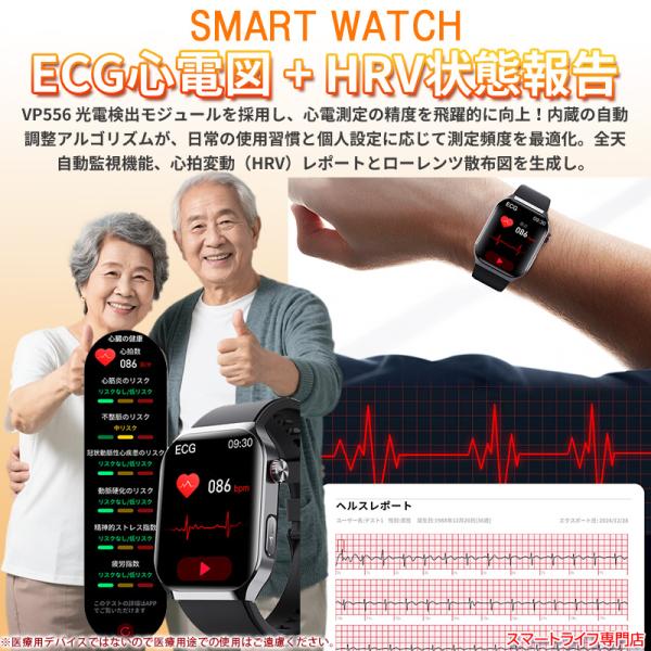 「医療レベル心電図ECG+PPG 」スマートウォッチ 日本製センサー 血糖値 血圧測定 着信通知 心拍数 血中酸素 睡眠管理 歩数計 体温 生理管理 LINE通知 胸貼り付き