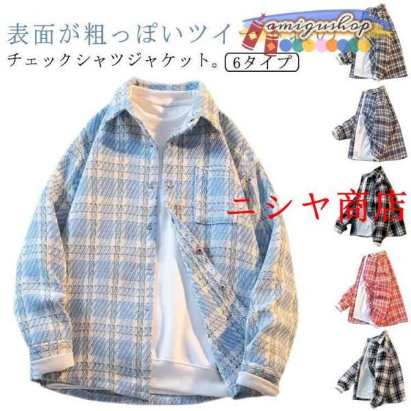ツイード シャツジャケット チェック柄 メンズ 秋 冬 長袖 厚手 柄シャツ チェックシャツ スナップボタン カジュアルシャツ ツイードジャケット 上着