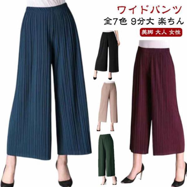 レディース 春夏 プリーツパンツ ワイドパンツ らくちん ゆったり 9分丈 ボトムス ハイウエスト 薄手 パンツ ズボン ウエストゴム ワイドパンツ