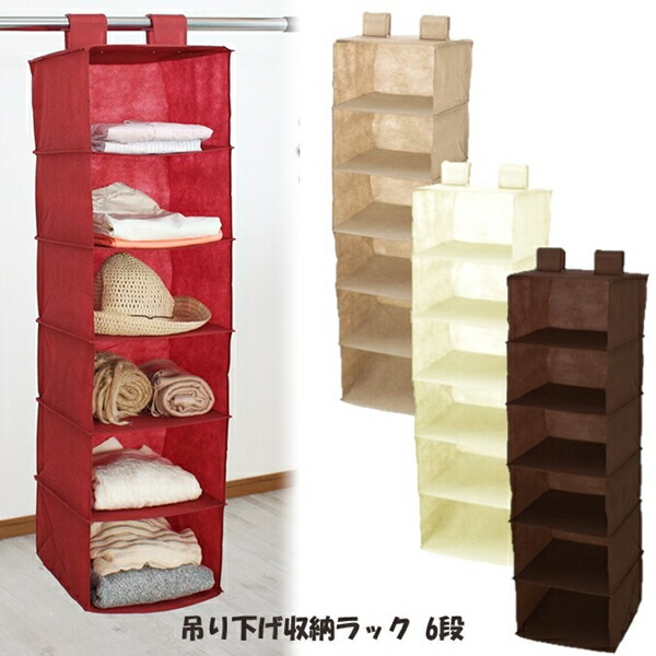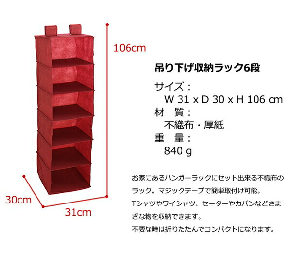 ■商品名:吊り下げ収納ラック 6段■サイズ:約幅31×奥行30×高さ106cm■重量:約0.84kg■カラー :ベージュ/レッド/アイボリー/ダークブラウン■材質 :不織布、厚紙■生産国:中国