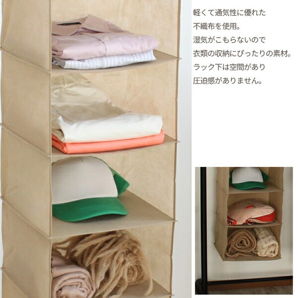 クローゼットはハンガーラック等を有効活用できる吊り下げタイプの収納ラック。クローゼットに吊るして、TシャツやYシャツ、セーターなどの衣服だけでなく、カバンや帽子などの収納にも最適。クローゼットやハンガーラックのパイプにマジックテープで巻きつけるだけの簡単設置。使わない時はコンパクトに折りたたんだ置けるので、邪魔になりません。生地の素材は適度な吸湿性・通気性があり、軽くて扱いやすい不織布を使用しております。