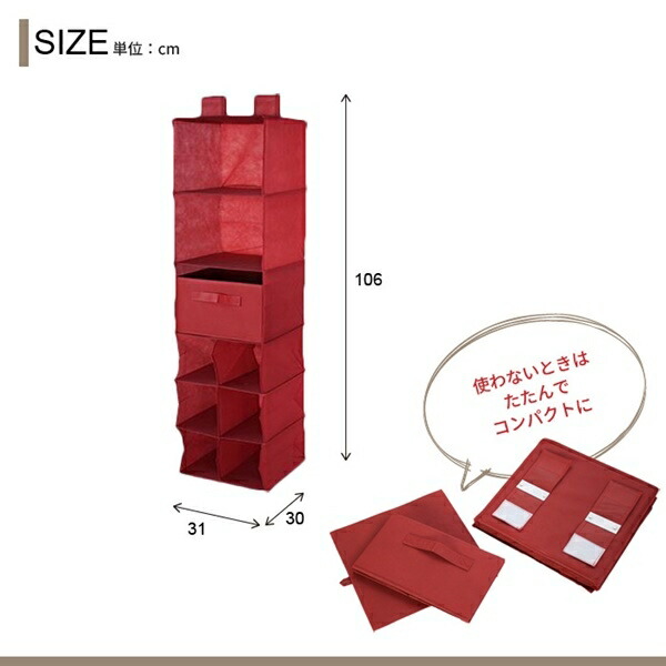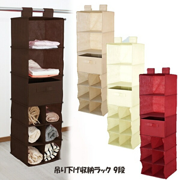 ■商品名:吊り下げ収納ラック 9段■サイズ:約幅31×奥行30×高さ106cm■重量:約1.13kg■カラー :ベージュ/レッド/アイボリー/ダークブラウン■材質 :不織布、厚紙■生産国:中国