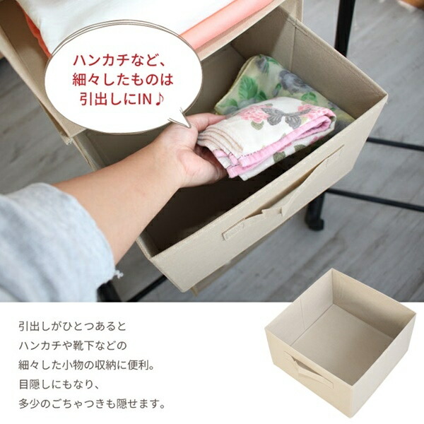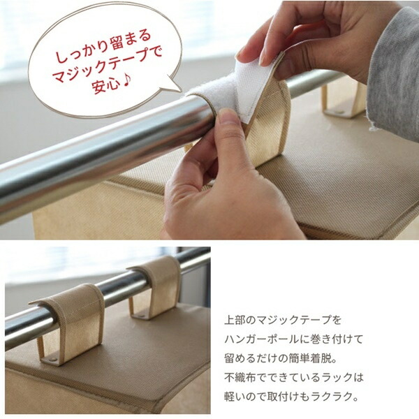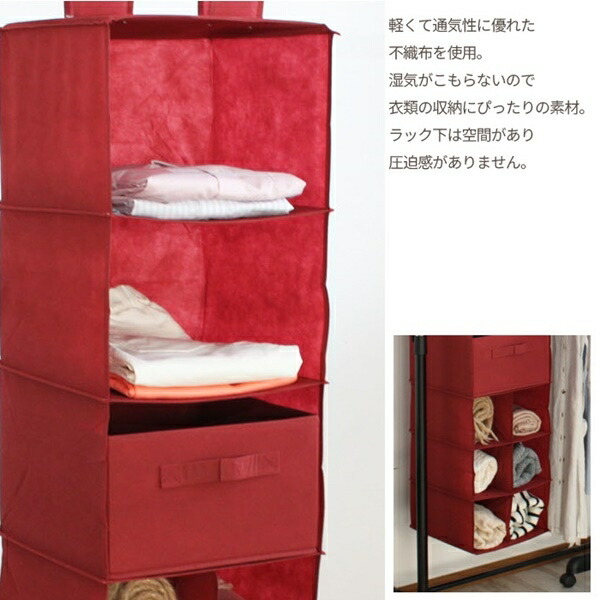 クローゼットはハンガーラック等を有効活用できる吊り下げタイプの収納ラック。クローゼットに吊るして、TシャツやYシャツ、セーターなどの衣服だけでなく、カバンや帽子などの収納にも最適。インナーボックスにはハンカチやハンドタイルなどの小物類を収納するのに便利。クローゼットやハンガーラックのパイプにマジックテープで巻きつけるだけの簡単設置。使わない時はコンパクトに折りたたんだ置けるので、邪魔になりません。生地の素材は適度な吸湿性・通気性があり、軽くて扱いやすい不織布を使用しております。