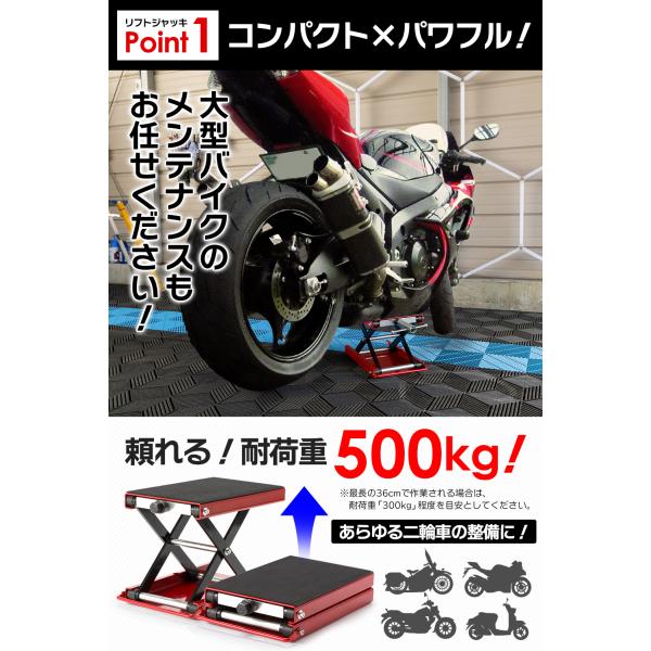耐荷重は500kgなので、小型バイクから大型バイクまであらゆる車両のメンテナンス等に使用可能です。