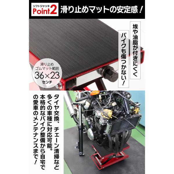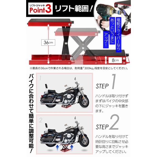 リフトの高さは約8cm〜36cmなので、様々なバイクに対応可能です。