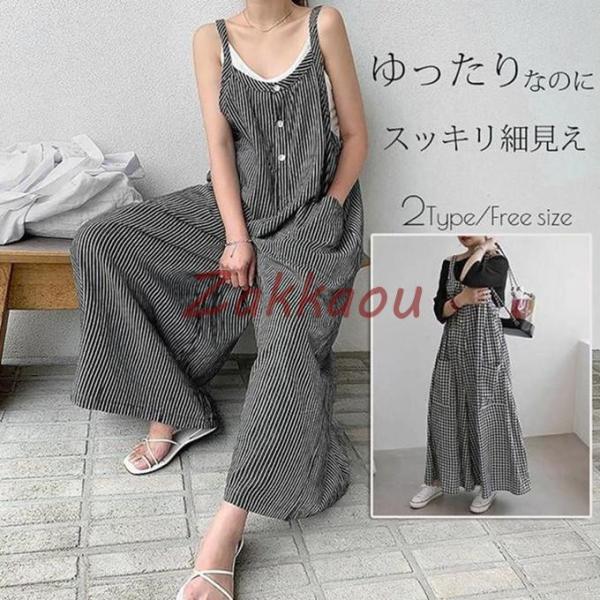サロペット パンツ レディース オールインワン ワイドパンツ ゆったり 重ね着 ズボン チェック柄 ストライプ カジュアル きれいめ ボトムス