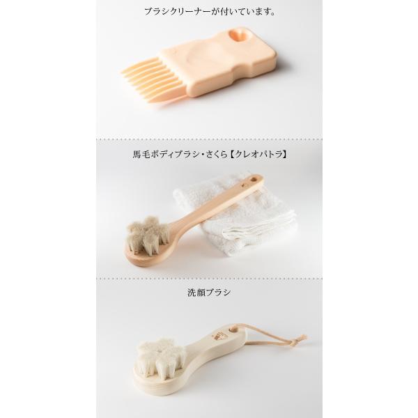 【材質】天然毛(ボディブラシ:白馬毛、洗顔ブラシ:やぎ毛)、持ち手:天然木(ひのき)、ブラシクリーナー:ポリアセタール
