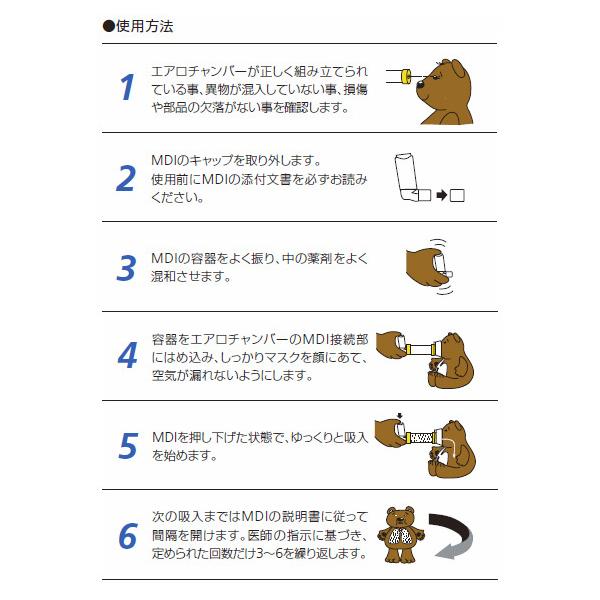 【使用方法】【マウスピースタイプ(大人用/キッズ用)】 大人用・キッズ用はカラー(デザイン)が違うだけで、仕様は同じです。 薬剤噴霧後、ゆっくり呼吸してから10秒ほど息を止め、マウスピースから口を外してゆっくり息を吐いて下さい。1回で吸入できない場合は、2〜3回に分けて吸入します。 フローホイッスルが鳴る場合は、吸入の速度が速すぎますので、ゆっくり吸うようにして下さい。