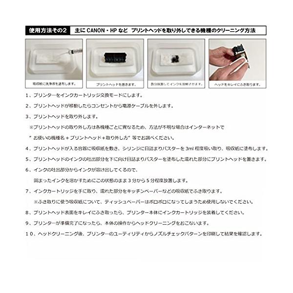 ・プリントヘッドの目詰まりを解消印字かすれ、色味がおかしい、インクが出ない、などの印字不良に。インクジェットプリンターのプリントヘッドによる印字トラブルを解消。プリントヘッドのノズルに固まったインクを取り除き、印刷不具合からプリンターを回復させるメンテナンスキット。使用方法もカンタンでどなたでもご使用頂けます。内容量は100ml=約50回の使用が可能です。