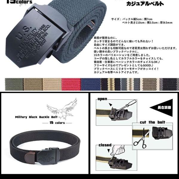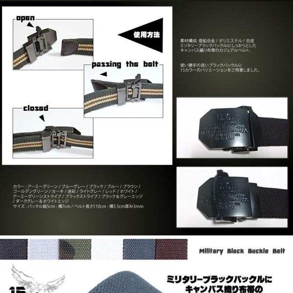 ミリタリーブラックバックルに しっかりとしたキャンバス織り布帯のカジュアルベルト。