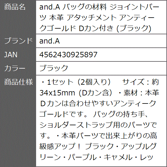 バッグの材料 ジョイントパーツ 本革 アタッチメント アンティークゴールド Dカン付き( ブラック)