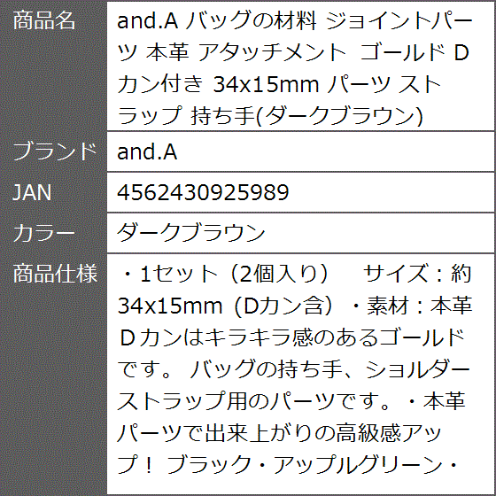 バッグの材料 ジョイントパーツ 本革 アタッチメント ゴールド Dカン付き 34x15mm ストラップ 持ち手( ダークブラウン)