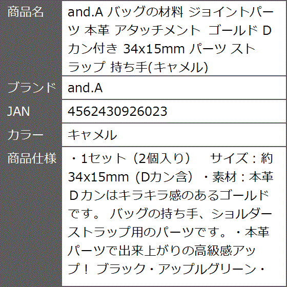 バッグの材料 ジョイントパーツ 本革 アタッチメント ゴールド Dカン付き 34x15mm ストラップ 持ち手( キャメル)