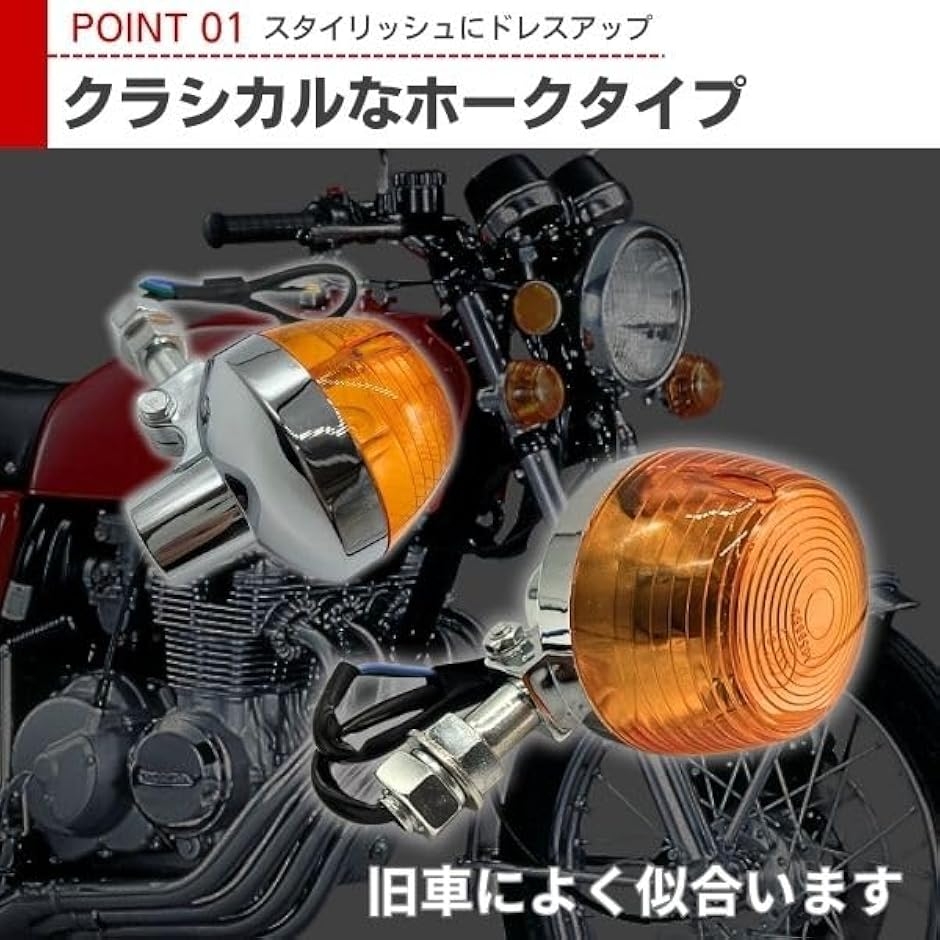「汎用性」さまざまなバイクに対応可能な汎用ウインカーセットです クラシックからモダンまで幅広い車種で使用可能なデザインと高い互換性が特徴です 夜間でも安心の高輝度アンバー発光を採用しています 愛車の修理や交換パーツとして、予備用にも適しています