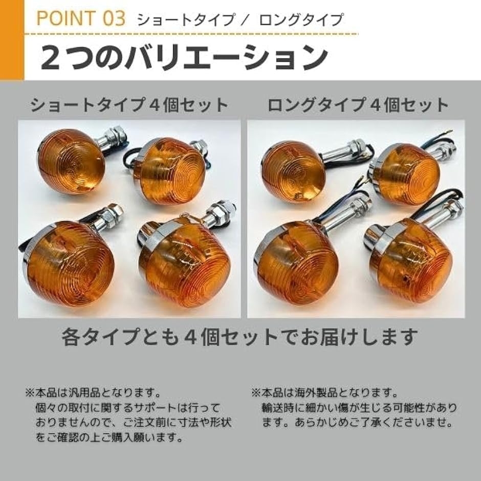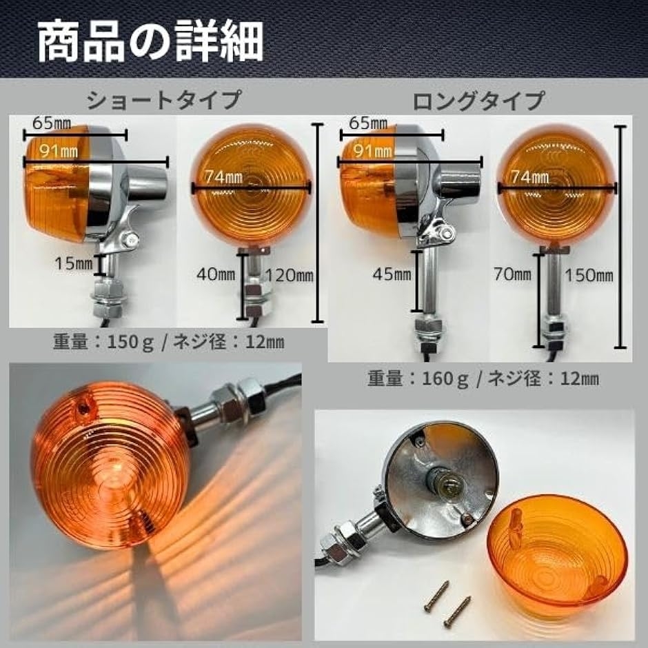「サイズ・バリエーション」ウインカー直径:74mm ウィンカー奥行:91mm ステー長さ [ショート]:40mm / [ロング]:70mm ネジ径:12mm 電圧:DC12V バリエーション:「ロングタイプ4個セット」「ショートタイプ4個セット」