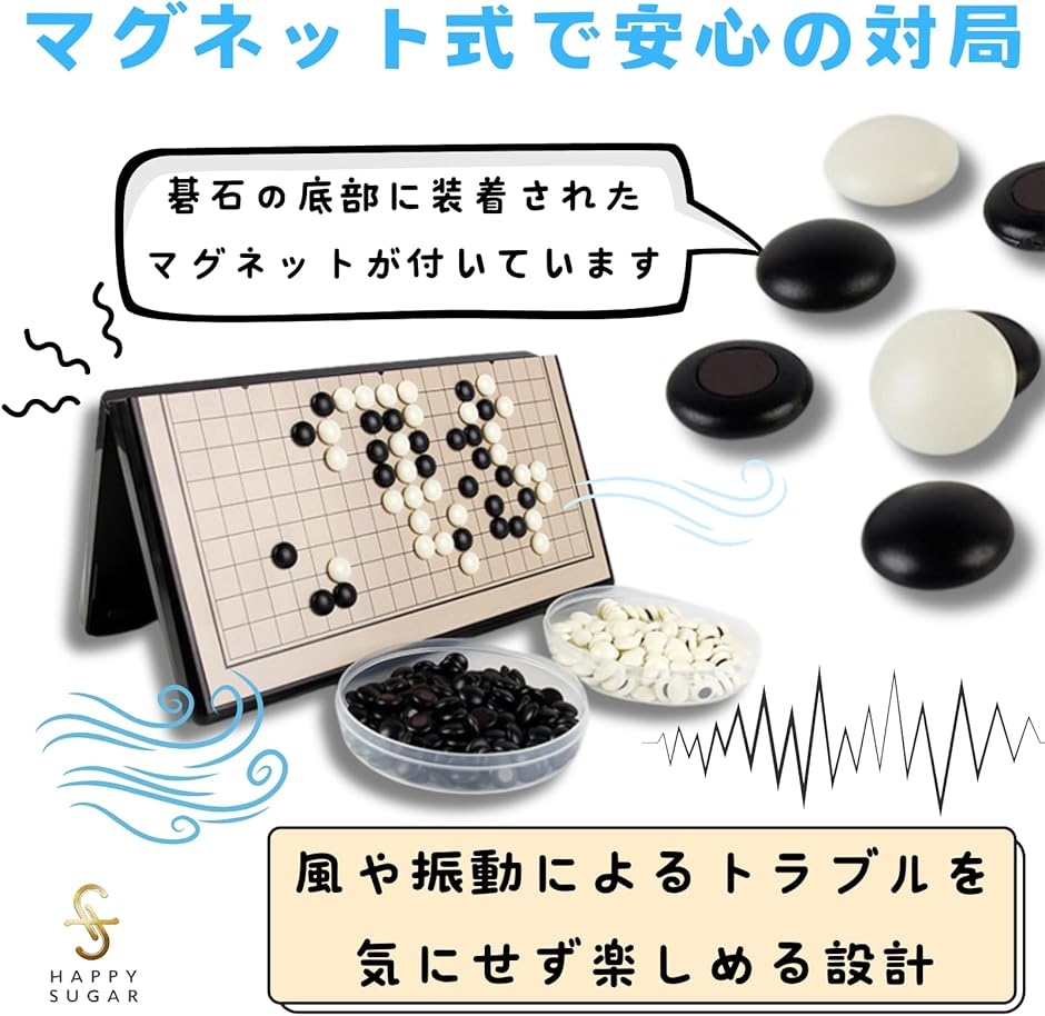 「マグネット式で安心の対局体験」碁石の底部に装着されたマグネットが付いています。