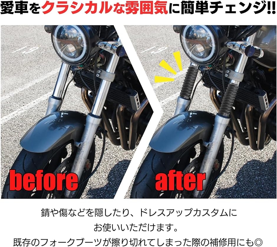 フロントフォークブーツは、擦り切れたブーツの交換や、クラシカルな雰囲気へのドレスアップを求める方におすすめのアイテムです。