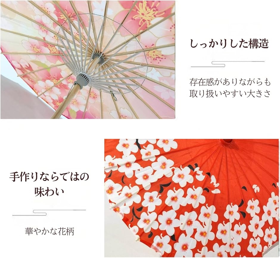 22本骨のしっかりした構造で開いた時の存在感があり、花柄の傘布が和装に美しく映えます。
