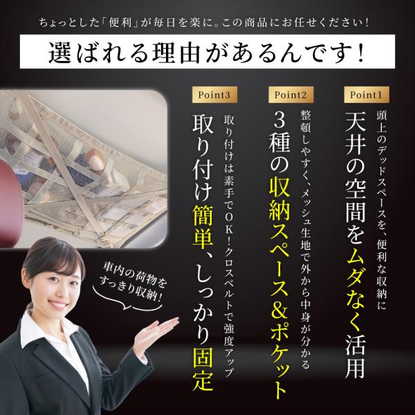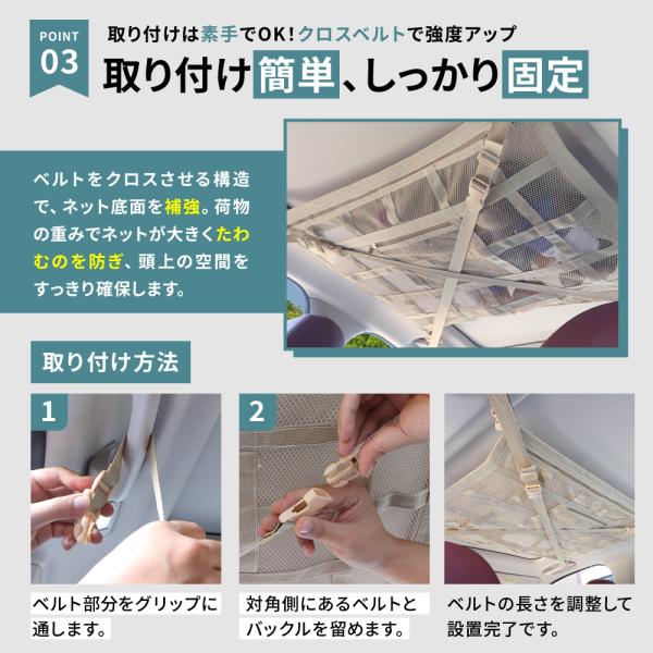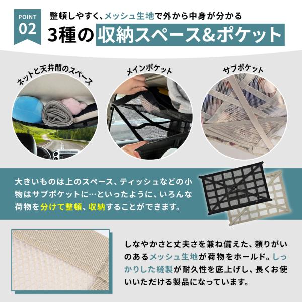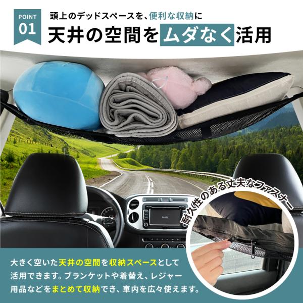 天井のデッドスペースを有効活用し、車内の荷物をすっきり収納できる天井収納ネットです。