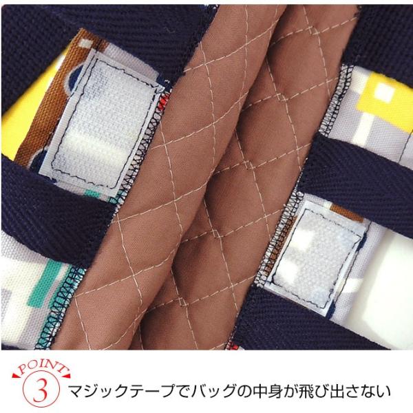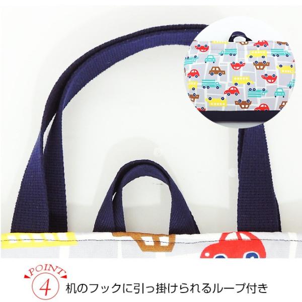 色とりどりのくるまがキュート。ネイビーの手提げ部分とそこの切り返しで幼くなり過ぎないデザインです。