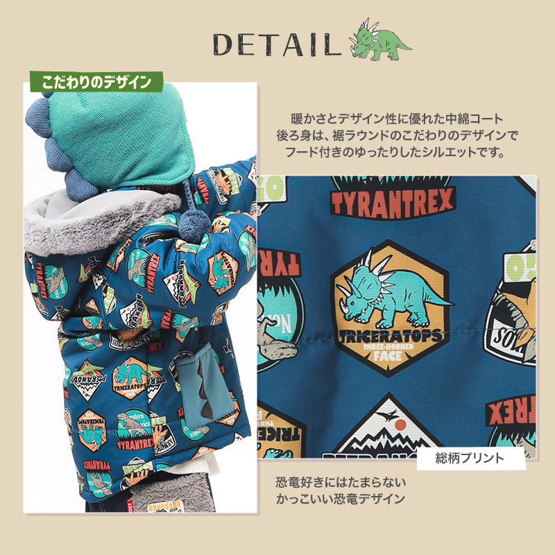コート ベビー 中綿 ジャケット 男の子 ダイナソー キッズ アウター フード 80cm 90cm 95cm ハーフ丈 あったか 防寒 撥水加工 GrinLab グリンラボ 子供服 恐竜