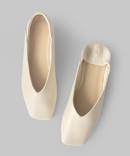 商品名:斜めワイドスクエアトゥのVカットフラットパンプス/かかとが踏めるバブーシュ