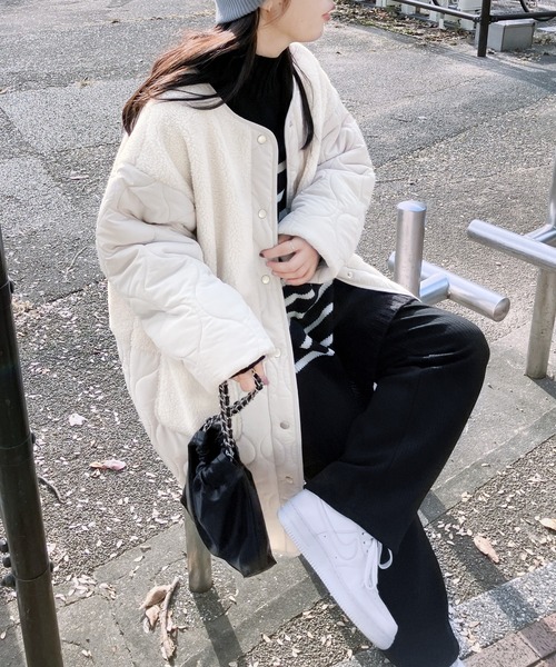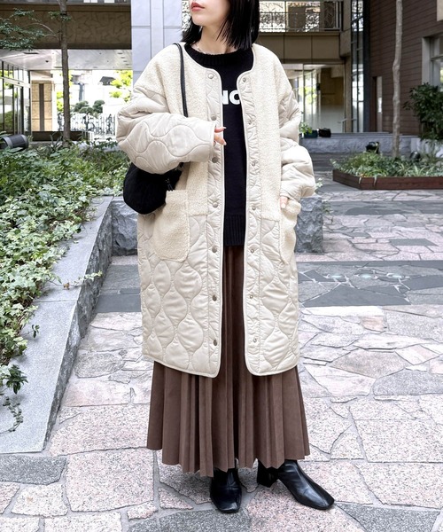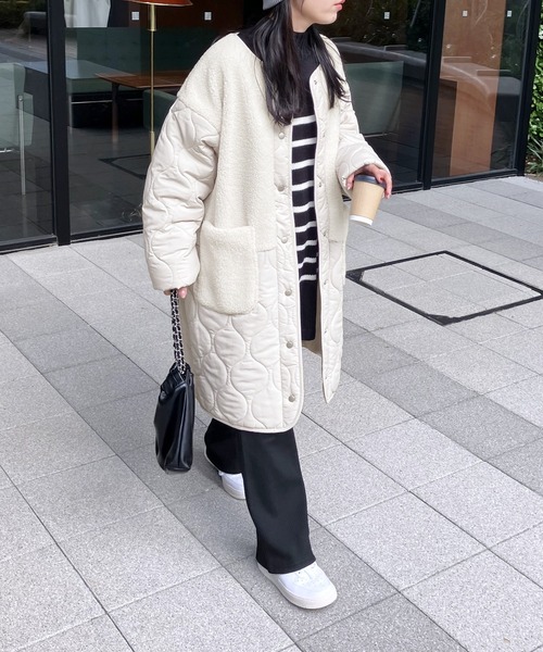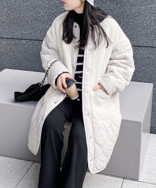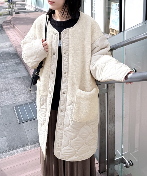 コート アウター ノーカラーボア×ひょうたんキルトコート レディース