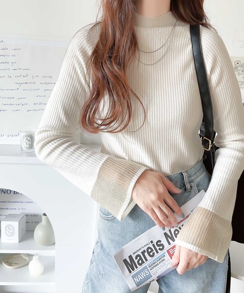 ニット セーター 動くたび大人フェミニン。袖ラメシアーハイネックリブニット レディース