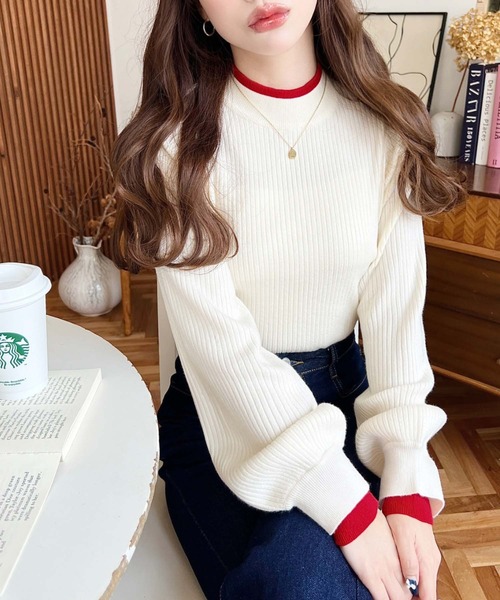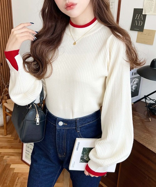 商品名:ボトルネックレイヤード風配色リブニットプルオーバー