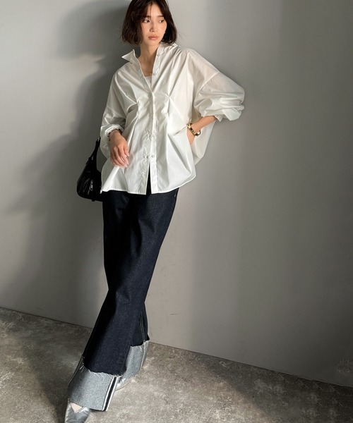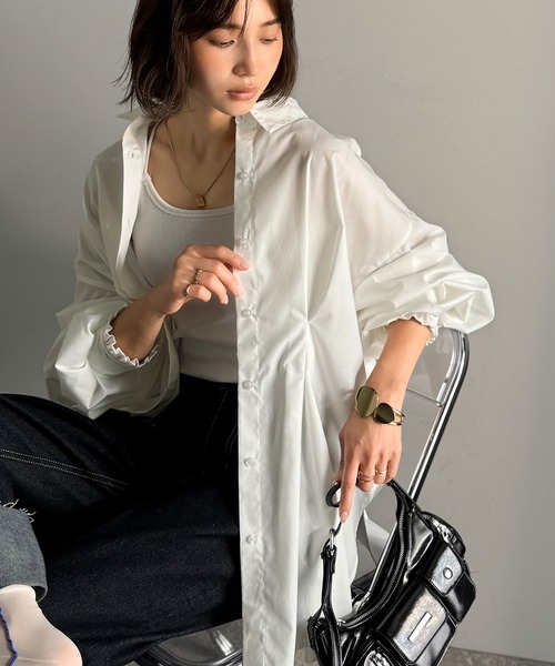 商品名:甘さ控えめの好バランス◎ウエストタック袖フリルビッグ長袖シャツ(無地・チェック柄・ストライプ柄アソート)