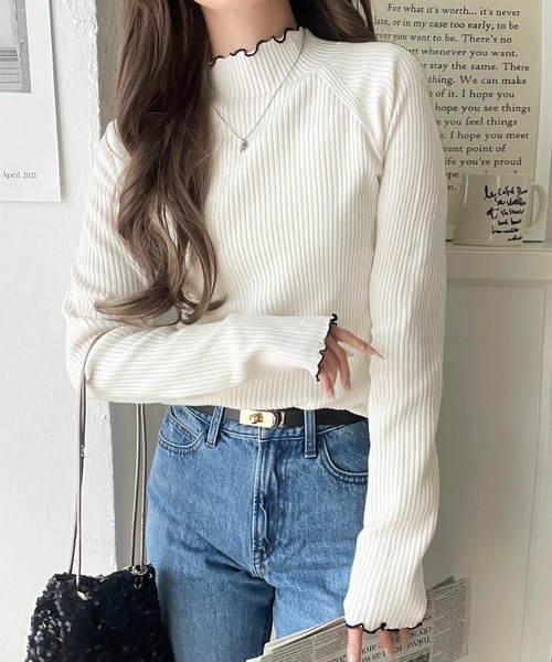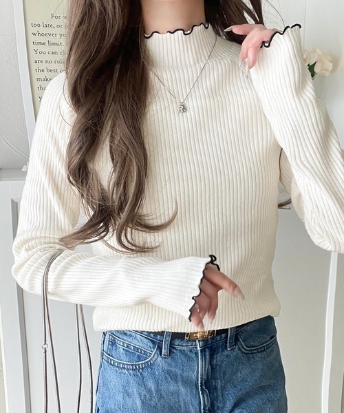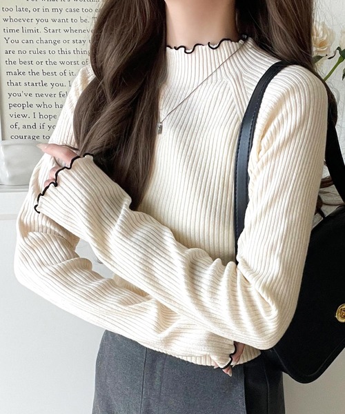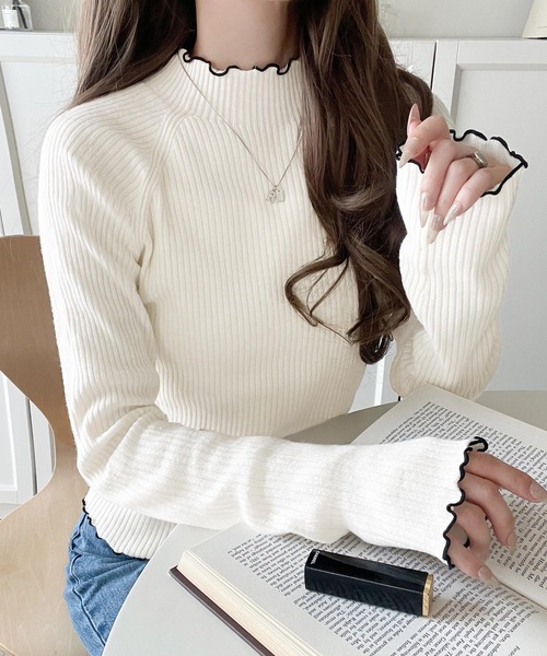 キーワード:ニット セーター レディース タートルネック フリル ライン ワンポイント 長袖 無地 WEB限定 オフィスカジュアル キレイめ デート ビジネス ベーシック 秋 春 定番