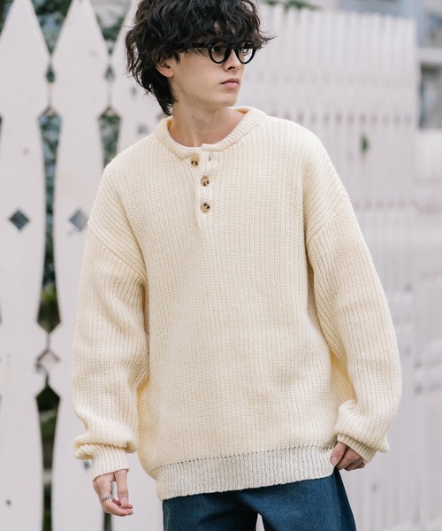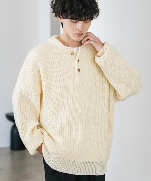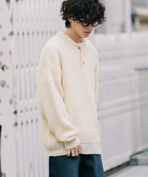 セーター ニット 新色追加 オーバーサイズ畦編みヘンリーネックニットセーター メンズ レディース