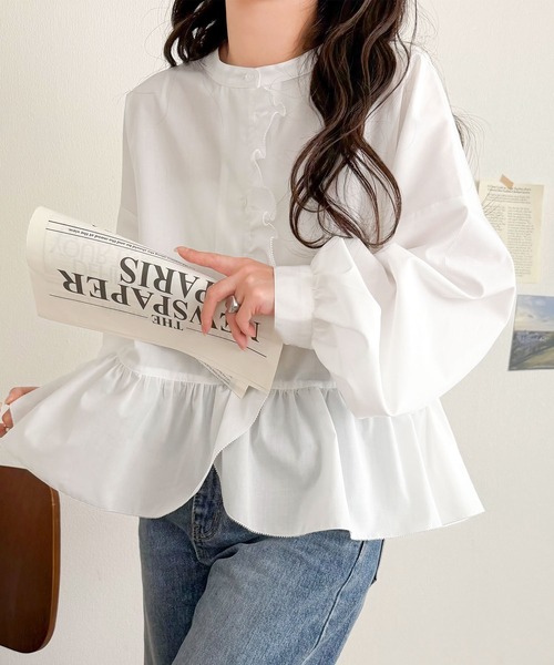 キーワード:ブラウス シャツ レディース コットン スタンドカラー ストライプ フリル ワンポイント 長袖 無地 WEB限定 オフィスカジュアル キレイめ ドライブ 授業参観 春 大人カジュアル 定番