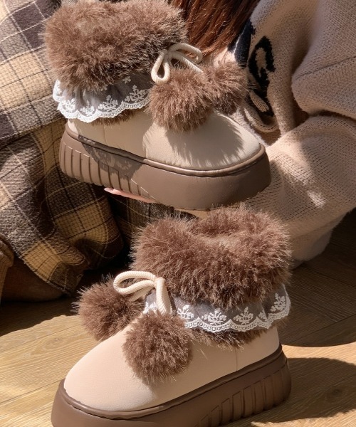 商品名:Y2Kガーリー レトロ厚底もこもこレースフリルハイカットスノーブーツ/ブーティ