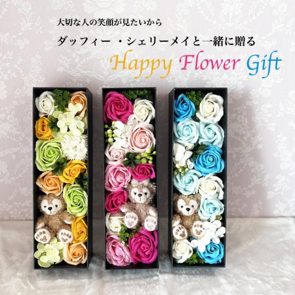 枯れないお花との組み合わせが華やかでダッフィー・シェリーメイ・リーナベルが大好きな様々な年代の方にとっても喜ばれています。 かわいいディズニーシー限定正規品のぬいぐるみ付です。特別感のある贈り物になる褒められギフトを♪
