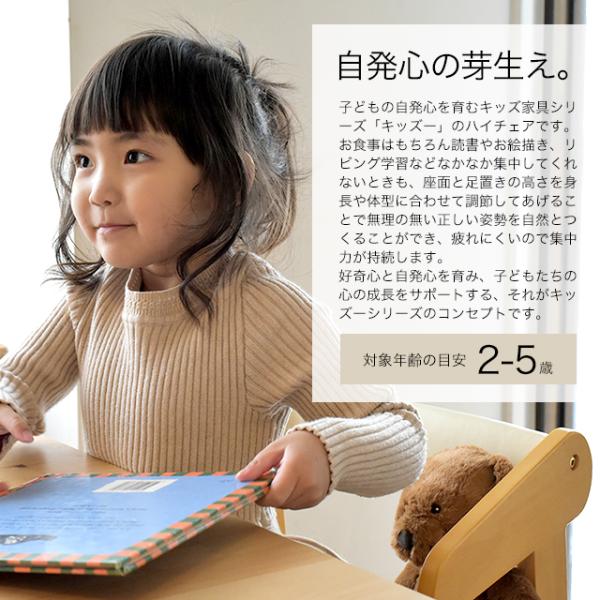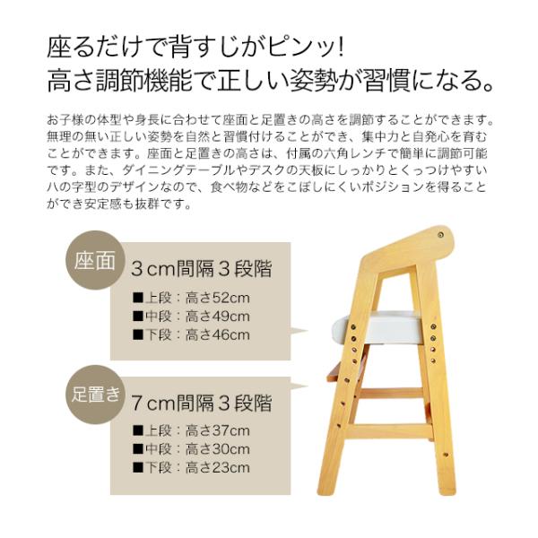 ダイニングに合わせやすいKidzooのキッズハイチェア。座面・足置きは30mmピッチで各3段階に調整でき、成長に合わせて正しい姿勢をサポートします。