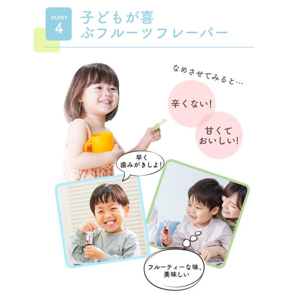 使用方法 適量を歯ブラシにとり、歯および歯ぐきをブラッシングしてください。うがいが上手にできないお子さまには、ブラッシング後、ガーゼなどでぬぐい取ってあげてください。