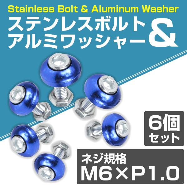 【送料220円】6個set M6 アルミ カラーワッシャー ナンバー ボルト 丸形 車 バイク ステンレスボルト M6 1.0 首下20mm ブルー 青