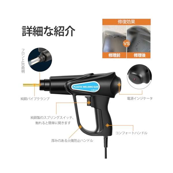 ・??快適なハンドル:人間工学に基づいて手のひらにフィットするように設計されており、操作が簡単で、長時間保持しても疲れません。 ハンドルには厚みのある火傷防止設計が施されており、高温の加熱物体を効果的に隔離し、誤って触れてしまうことによる火傷を防ぎます。 プラスチック溶接機にはLEDライトが装備されており、暗い環境での作業がより便利になります。