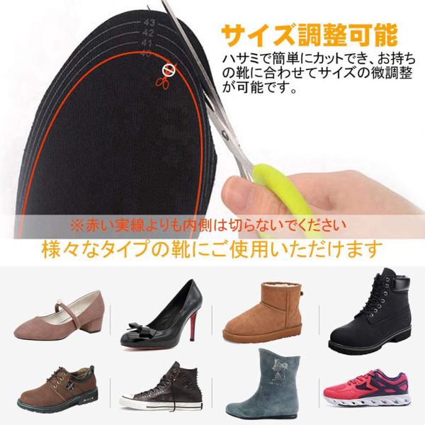 【サイズ調整可能】Mサイズ(約230~250mm) Lサイズ(約250~275mm) 様々な靴に適用します。一般的な中敷き同様に靴のサイズに合わせて先端部分をハサミなどで切り取ってご使用ください。