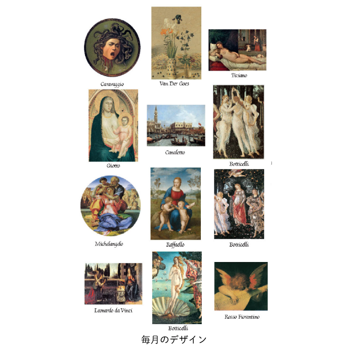 フィレンツェにあるルネサンス絵画の宝庫とも呼ばれ、古代ギリシア時代からの美術品(メディチ家のコレクション)を収蔵するウフィツィ美術館所蔵のアートを集めたコンパクトな卓上カレンダー。ヴィーナスの誕生をはじめ、ボッティチェリ、ラファエロ、ダ・ヴィンチ、カラバッジョ、カナレットなどの名作入り。