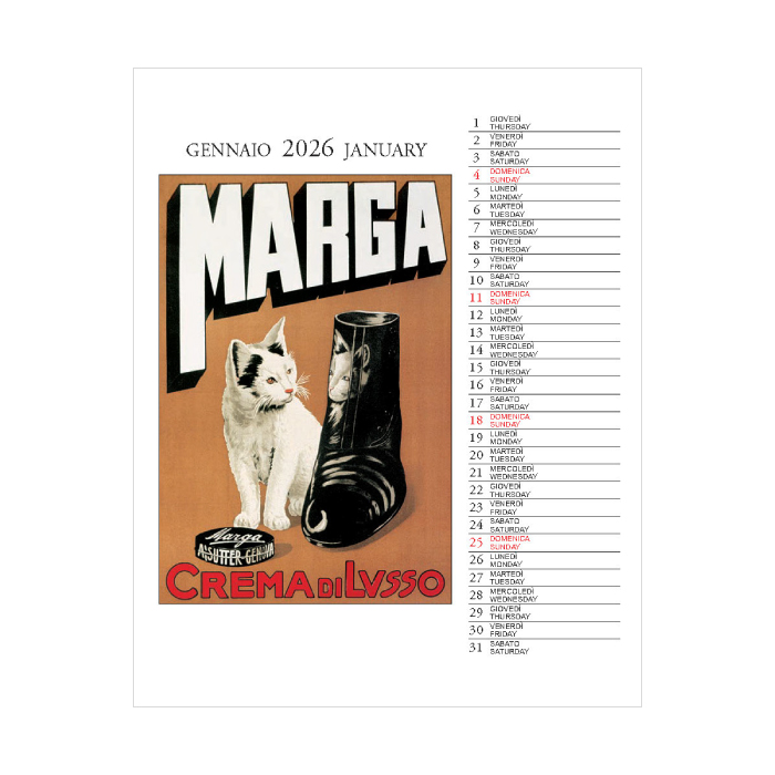 ネコとイタリアのモチーフを合わせて描かれたヴィンテージ広告やアート(スランタン等)を集めたコンパクトな卓上カレンダー。