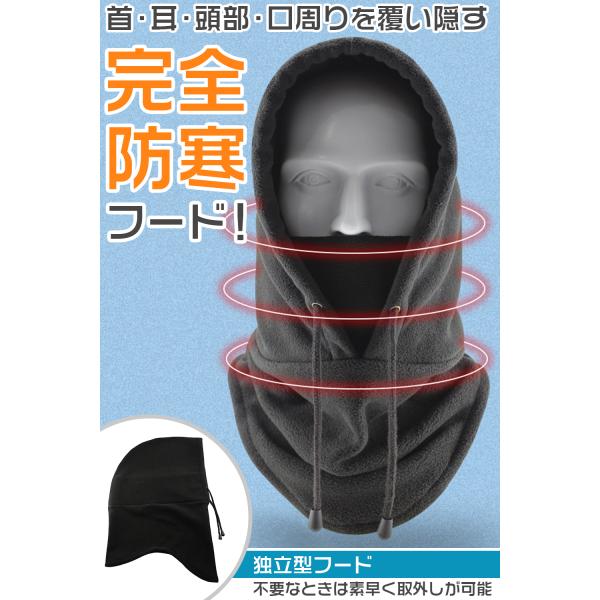 首、耳、頭部、口周りを覆い隠す完全防寒フード! 独立型フードなので必要なときはさっと着用、不要なときは素早く取外しが可能。